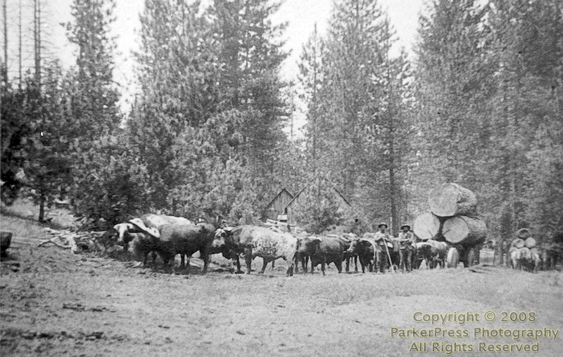 In the early logging days it was easier to move the mill to the logging area than to bring the logs a long distance to the mill. Sometimes horses but more often a 12 bull ox team was used to pull a heavy, steel rimmed, wooden wheeled logging wagon. When the logging operation was close to the mill, logs could be skidded down the hill in a wooden chute or track or pulled uphill by cables attached to a steam donkey engine. There was not enough water for ponds so the logs were dry decked. The area surrounding a mill would be logged off in about 10 years, consequently, the Blairs moved their mill sites about every 10 years. Other major Blair Mill sites were: 1870 to 1880 – South Long Canyon, 1880 to 1890 – North Long Canyon, 1890 to 1908 – Sly Park Mill, 1908 to 1910 – Plum Creek Mill, 1911 to 1912 – Fresh Pond Mill, 1913 to 1925 – Long Canyon out Old Blair Mill Road, 1927 to 1948 – across the canyon from Pacific House.