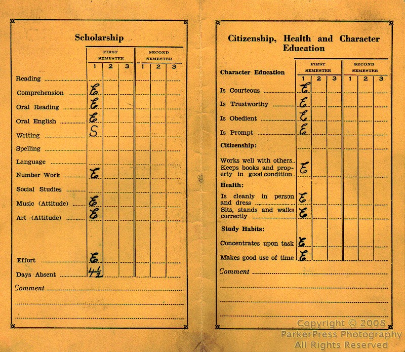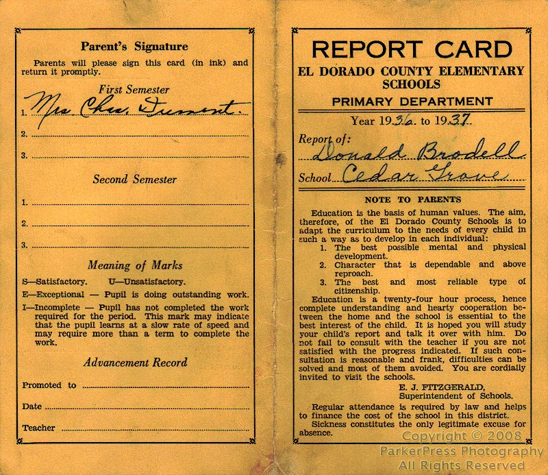 - Report card of Donald Brodell (courtesy of Mildred Atkins, his mother)