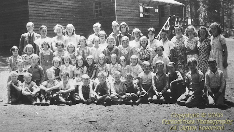 By 1935 the school enrollment was increasing steadily. The summer session school was changed to one observing the regular school calendar. A partition divided the one room into two, and Bill Baumhoff’s wife, Ruth was hired as a second teacher. The 1936-37 school year opened August 31st with about 20 students in Mrs. Anna Thomas’ class, grades five through eight. Mrs. Baumhoff was teaching grades one through four with about 35 students.