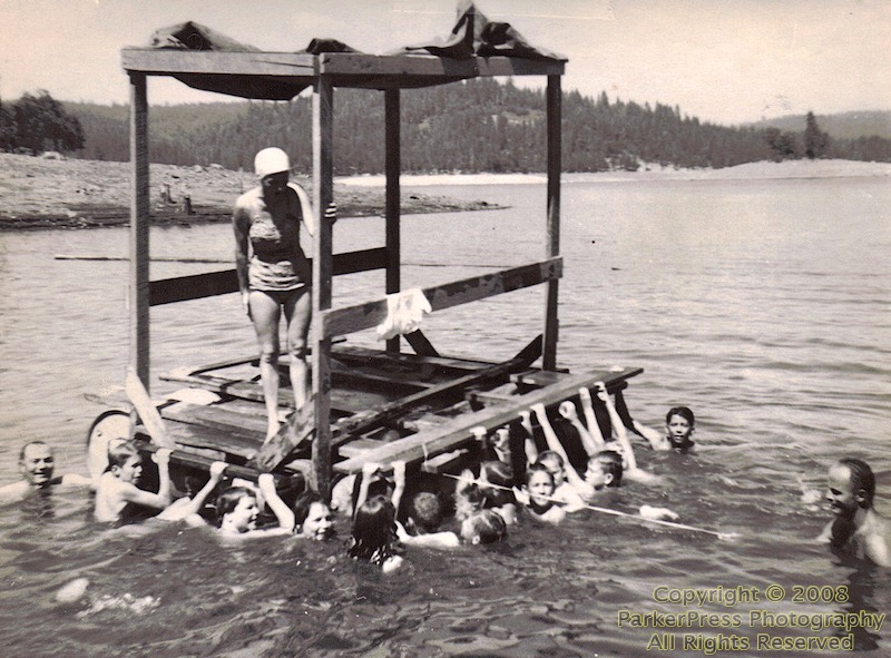 - Pinewood swim raft at Sly Park, summer of 1962. Larry Slater on the far left, Ron Parker on the far right, Margaret Slater on the raft. Students unidentified.