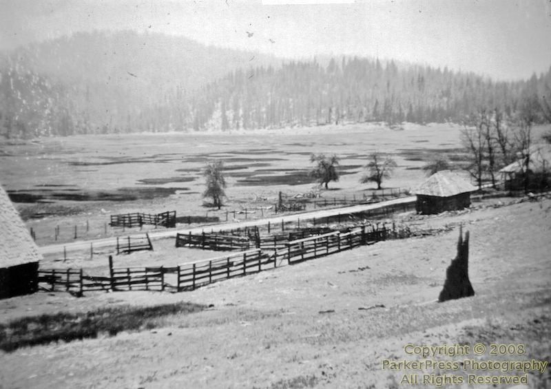 The meadow was a favorite stopping place for ranchers driving their stock to the upper mountain ranges to graze for the summer and fall. About 20,000 head of cattle and 10,000 head of sheep might be driven through Sly Park Valley in a year. The industrious Mr. Cutler established a two story frame hotel with 15 rooms, a dormitory to accommodate 15 to 20 men, a dining room and a bar. A small post office building adjoined the hotel on the east. The cattlemen as well as teamsters and other travelers all were accommodated at the hotel. There were two large dance platforms where dances were held nearly every Saturday night. George Holcomb played the violin, and Robert Carmichael played the banjo and harmonica at the same time.