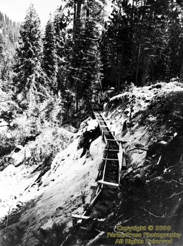 The soil wasn’t suitable for a canal so a wooden flume was built four feet wide and three and one half feet deep. The joints were covered with canvas. The flume went from the South Fork of the American River, at the foot of Randolf Canyon, to Long Canyon, then to Reservoir Hill. The flume had a grade of 4 feet per mile. John Kirk was involved in building the reservoir. It took from 1853 until 1854 to complete the 25 miles of flume. Due to oversight and carelessness, the cost far exceeded the $500,000 allocation.