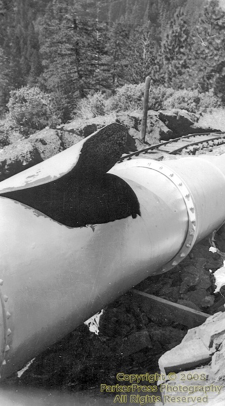 - A rip in the penstock that runs from forebay lake to the El Dorado Powerhouse on the South Fork of the American River. About 1940